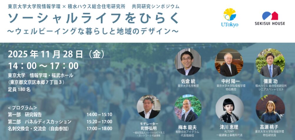 東京大学大学院情報学環と積水ハウス総合住宅研究所の共同研究チーム(ソーシャルライフ研究会)は、今後の住まいの空間とそこでのサービスのデザイン、まちや社会の仕組みづくりの可能性と課題を社会デザインの視点も交えながら明らかにしてきました。当シンポジウムが、ソーシャルライフの社会実装を場・対象・担い手などさまざまな視点から考え、具体的な提案の入口へと結び付ける機会となることを期待しております。