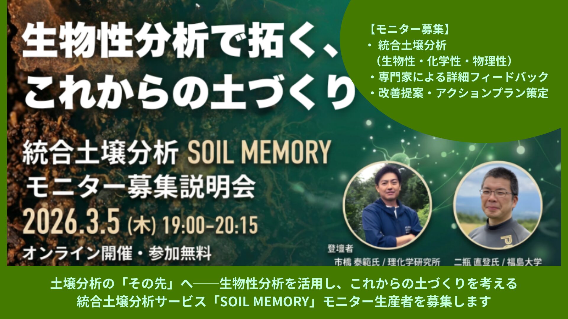 生物性分析で拓く、これからの土づくり 統合土壌分析 SOIL MEMORY モニター募集説明会 (オンライン開催)